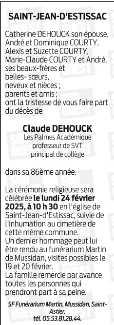 Décédé à Saint-Jean-d'Estissac (24140, France) le dimanche 16 février 2025 à l'âge de 85 ans